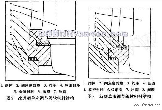 隨著工業技術的發展,用戶希望獲得更高質量的閥門,同時也要求提高閥門的使用、維修水平。這就對工程技術人員提出了新的要求,除了要精心設計出高質量和高水平的閥門,合理選用和正確操作之外,還要方便維修人員的維修和拆卸,方便快捷,使各類事故及維修時間降到最低限度。于是,對于單座調節閥來說,就出現了圖2所示的改進型軟密封結構設計。在這種結構設計中,用金屬擋環和軟密封環代替了傳統結構中用螺釘固定嵌入式軟密封環的設計,用壓套和閥座密封墊直壓式結構設計代替了傳統結構中閥座采用螺紋連接的設計。這樣的設計優點是當閥瓣和閥座達到最后關閉位置時,閥瓣給閥座的部分力由金屬擋環承擔,并直接傳到閥座,這樣就排除了軟密封環因過載而損壞,而且金屬擋環還提供了一定的輔助密封作用。直壓式結構設計也改變了需要專用工裝才能拆卸的螺紋連接閥座設計,裝配與拆卸、現場維修與更換都十分方便。